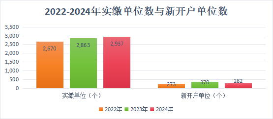 (一)缴存:2024年,新开户单位282家,净增单位74家;新开户职工1.01万人,净增职工-0.23万人;实缴单位2937家,实缴职工16.83万人,缴存额29.15亿元,分别同比增长2.58%、下降1.35%、增长2.39%。2024年末,缴存总额302.8亿元,比上年末增长10.65%;缴存余额123.62亿元,比上年末增长4.56%。受委托办理住房公积金缴存业务的银行6家。