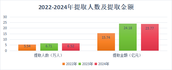 (二)提取:2024年,6.52万名缴存职工提取住房公积金;提取额23.77亿元,同比下降1.70%;提取额占当年缴存额的81.54%,比上年下降3.37个百分点。2024年末,提取总额179.18亿元,比上年末增长15.30%。