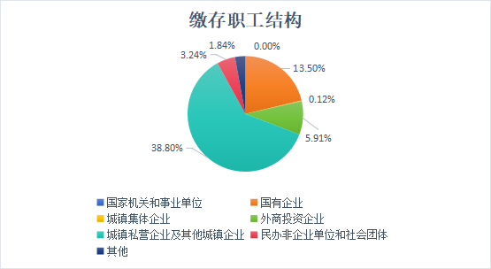 缴存职工中,国家机关和事业单位占36.59%,国有企业占13.50%,城镇集体企业占0.12%,外商投资企业占5.91%,城镇私营企业及其他城镇企业占38.80%,民办非企业单位和社会团体占3.24%,其他占1.84%;中、低收入占99.93%,高收入占0.07%。