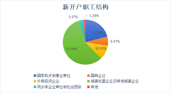 新开户职工中,国家机关和事业单位占21.04%,国有企业占6.47%,外商投资企业占10.33%,城镇私营企业及其他城镇企业占57.40%,民办非企业单位和社会团体占3.37%,其他占1.39%;中、低收入占99.97%,高收入占0.03%。