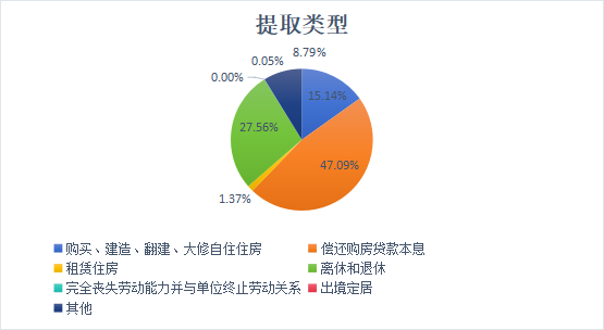 提取金额中,购买、建造、翻建、大修自住住房占15.14%,偿还购房贷款本息占47.09%,租赁住房占1.37%,离休和退休提取占27.56%,完全丧失劳动能力并与单位终止劳动关系提取占0.05%,出境定居占0.00%,其他占8.79%。提取职工中,中、低收入占99.84%,高收入占0.16%。