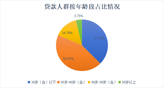 贷款人群中,40岁以下占比较大。贷款职工中,30岁(含)以下占42.95%,30岁-40岁(含)占40.74%,40岁-50岁(含)占11.95%,50岁以上占4.36%。