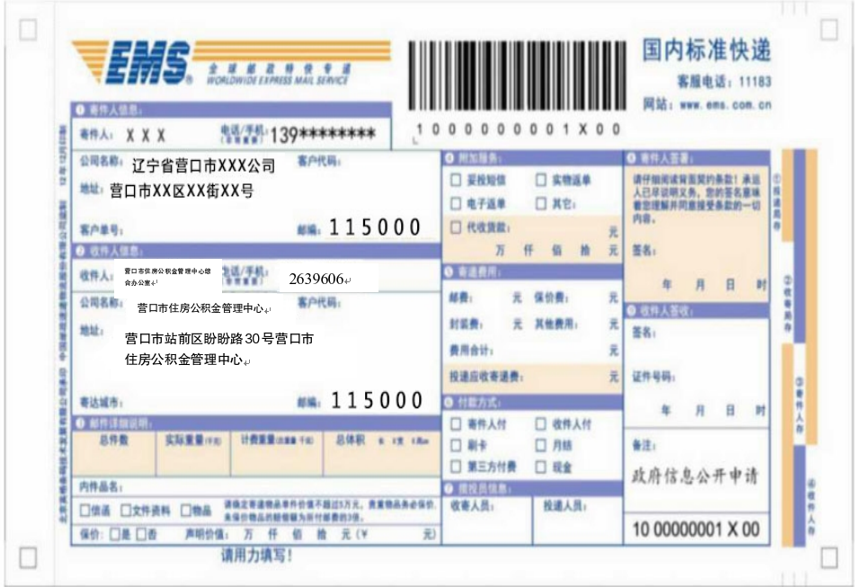 2.向营口市住房公积金管理中心申请政府信息“特快专递”式样